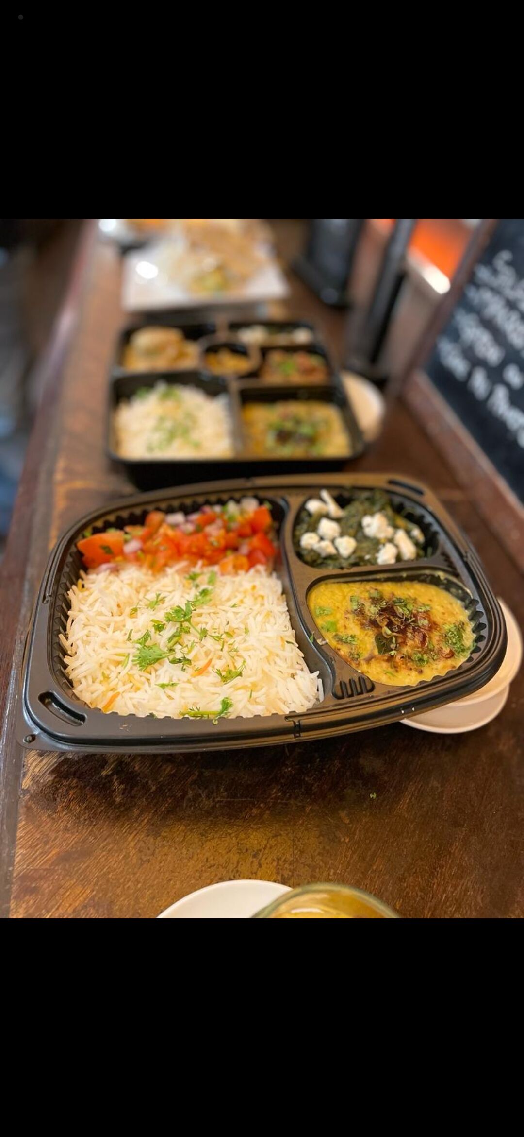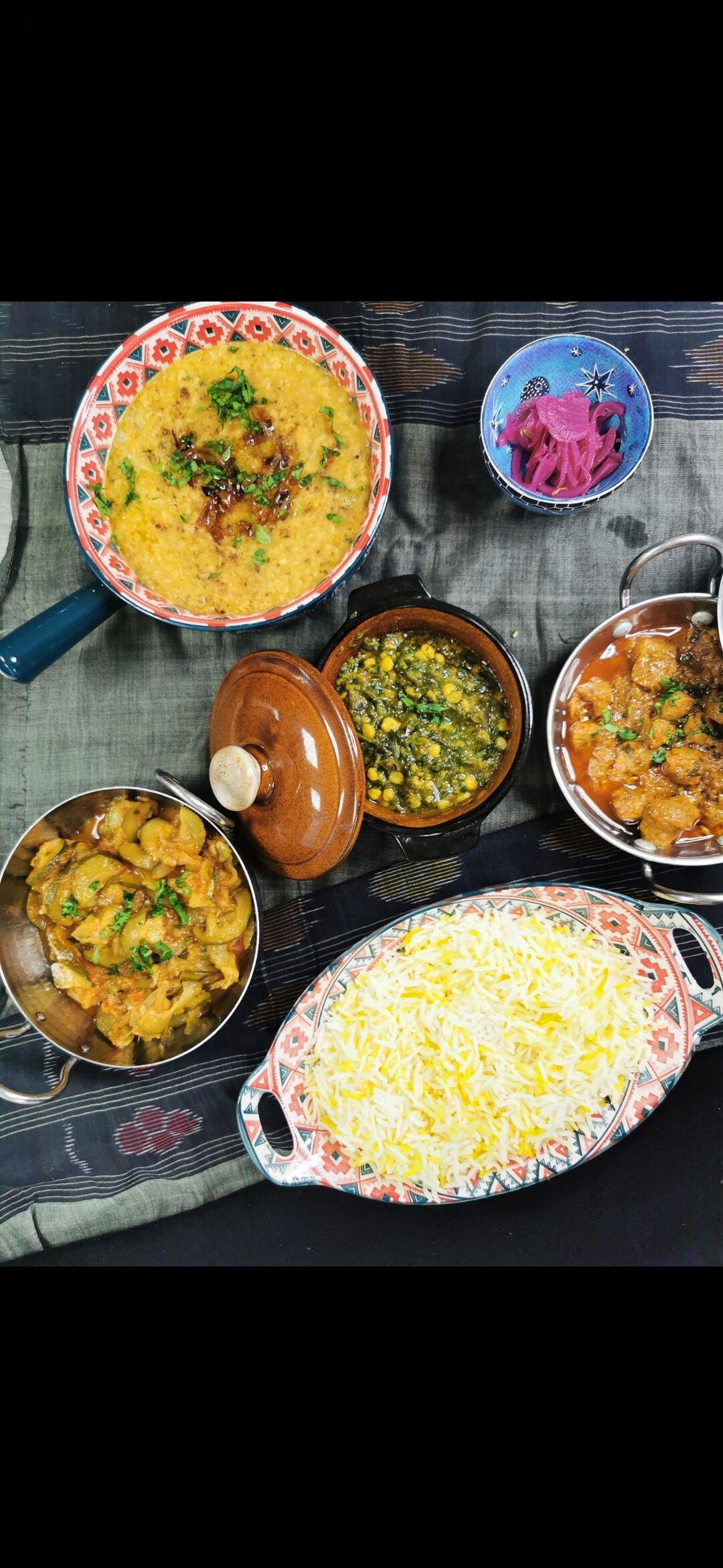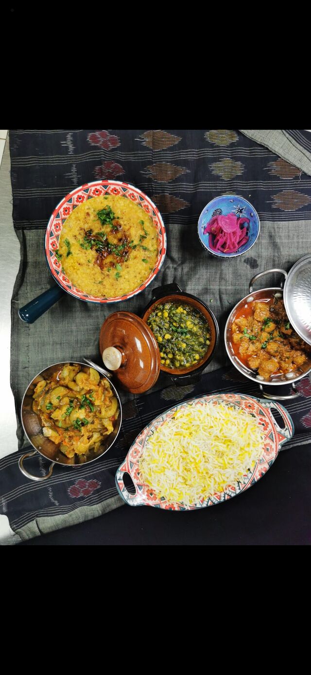 Assortiment de viandes et de plats végétariens, riz parfumé, curry de lentilles ou légumes.