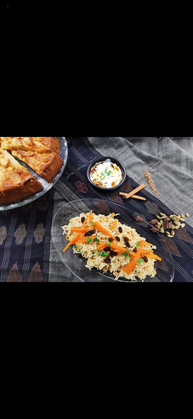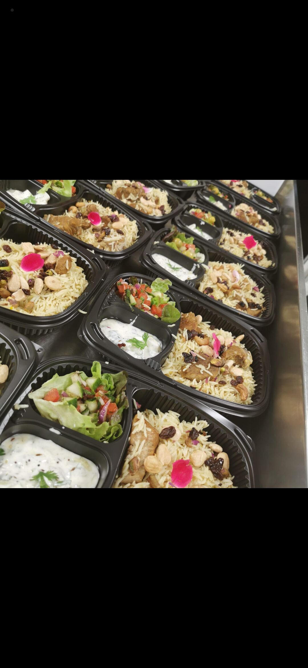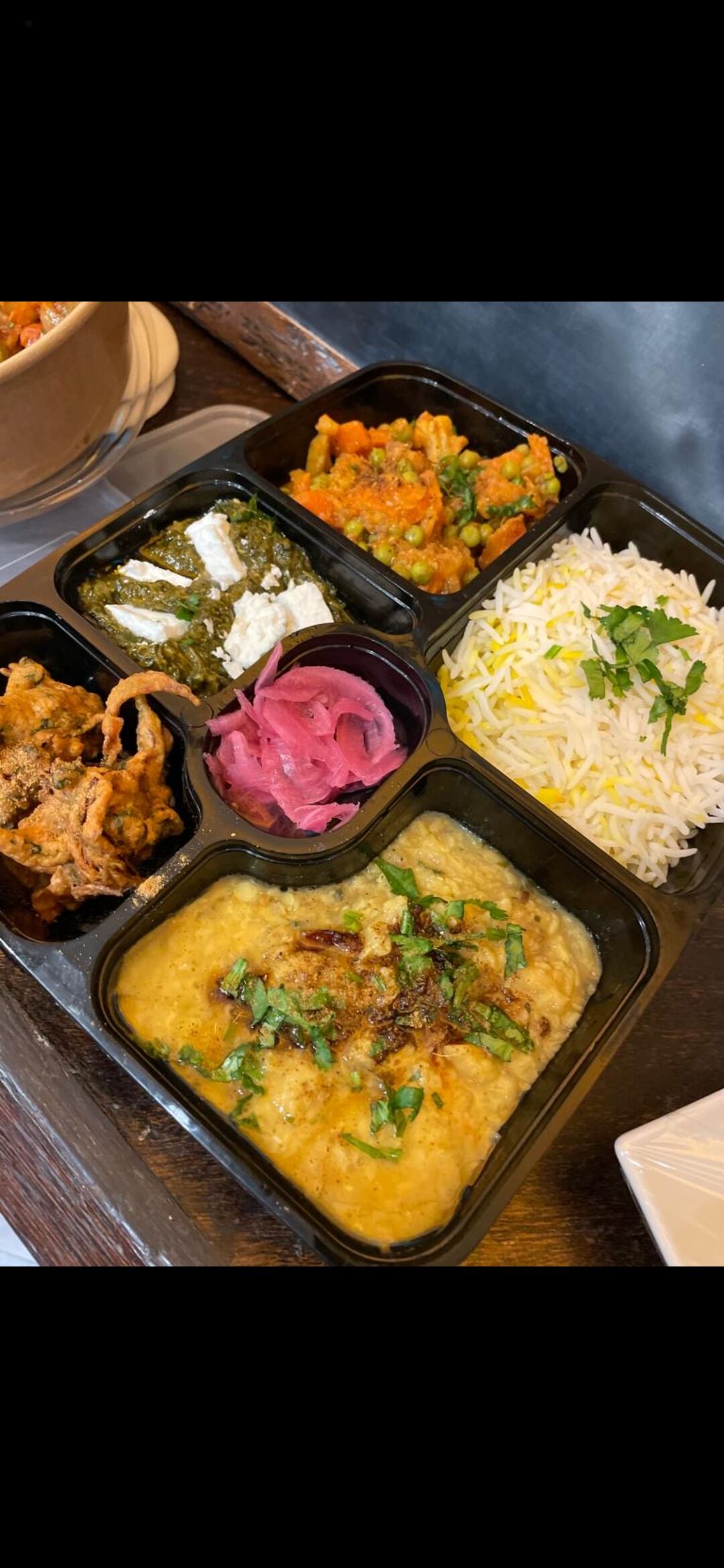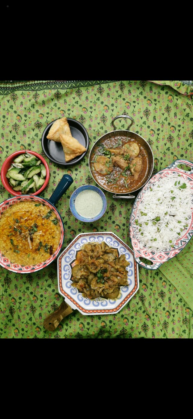 Assortiment de viandes et de plats végétariens, riz parfumé, curry de lentilles ou légumes.
